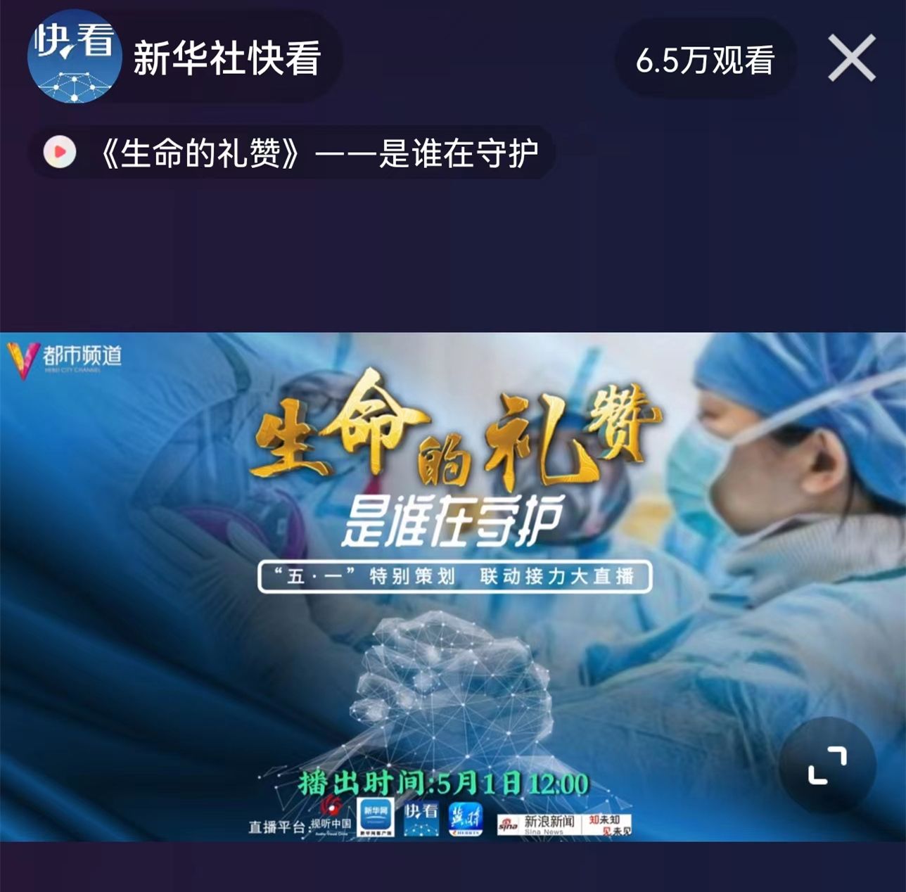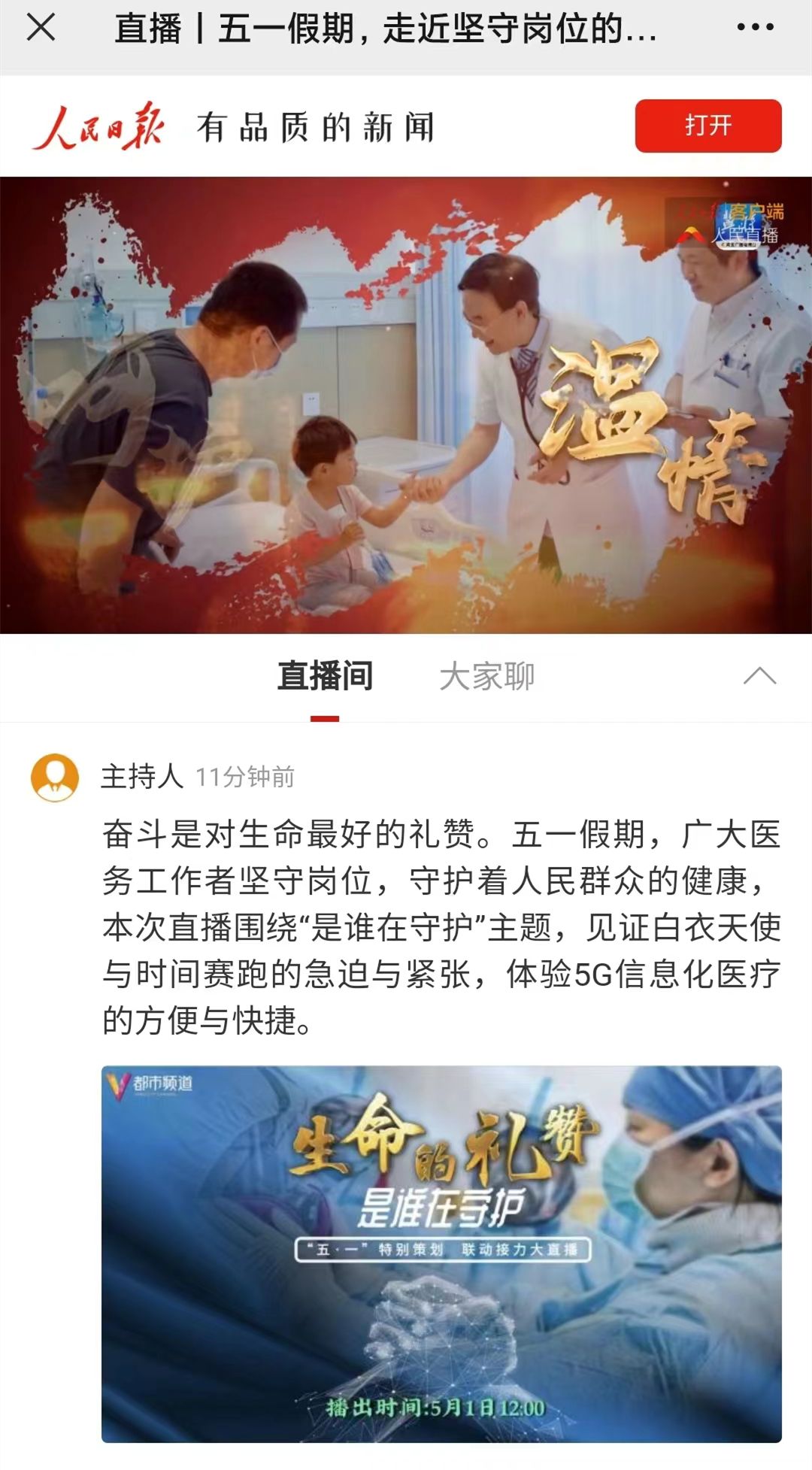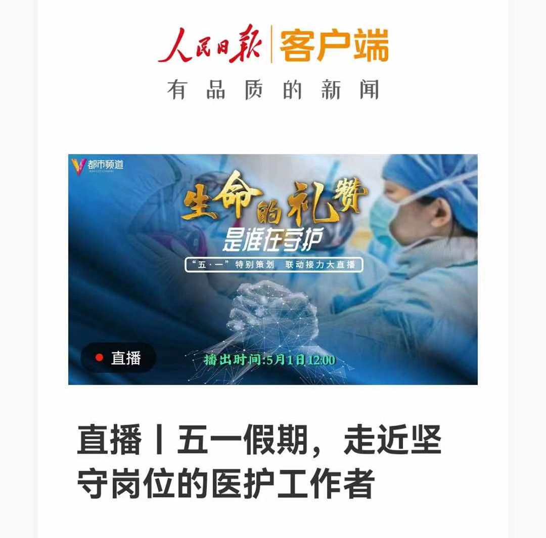 人民至上,生命至上。五一假期,廣大醫務工作者堅守崗位,為人民群眾豎起健康屏障!都市頻道傾力打造《生命的禮贊》“五?一”特別節目聯動接力全媒體大直播,走近堅守崗位的醫務工作者,向他們致敬,向所有勞動者致敬!