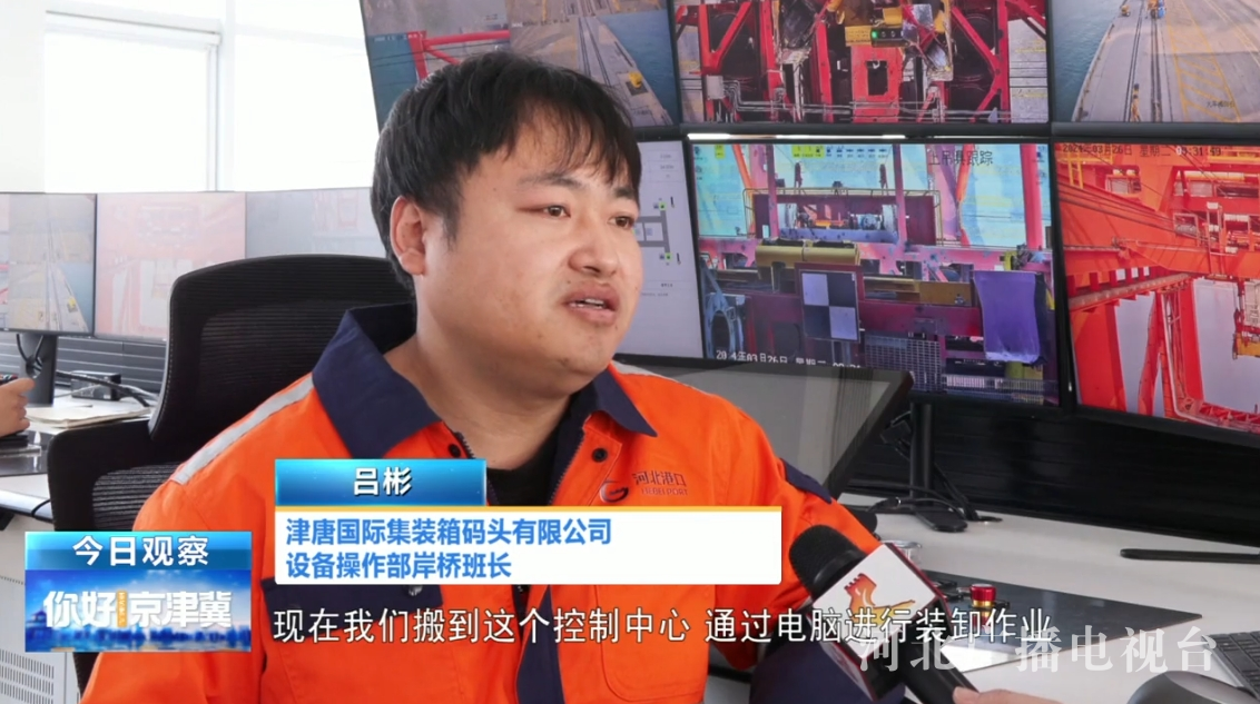 津唐國際集裝箱碼頭有限公司設備操作部岸橋班長 呂彬:過去我們岸橋裝卸一直都是,通過一雙眼睛以及工作經驗來進行作業,現在我們搬到這個控制中心,通過電腦進行裝卸作業。