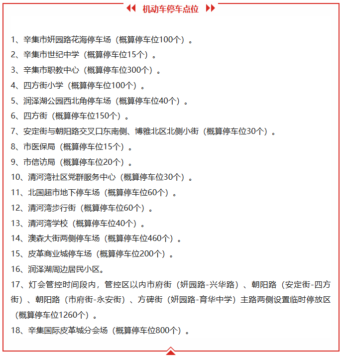 2月10日至3月4日,辛集市將實行市內公共交通免費乘坐惠民政策,全面推行“招手即停”便民服務,全力滿足市民游客賞燈、購物、游玩等多元化出行需求。辛集市還增設了包括辛集市醫保局、辛集市信訪局等機關事業單位在內的免費臨時停車點位,共計3680余個。開放時間為2月10日至3月4日,共23天。