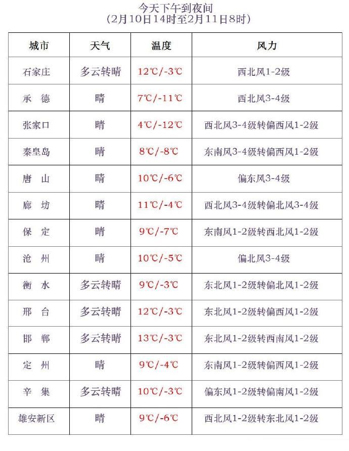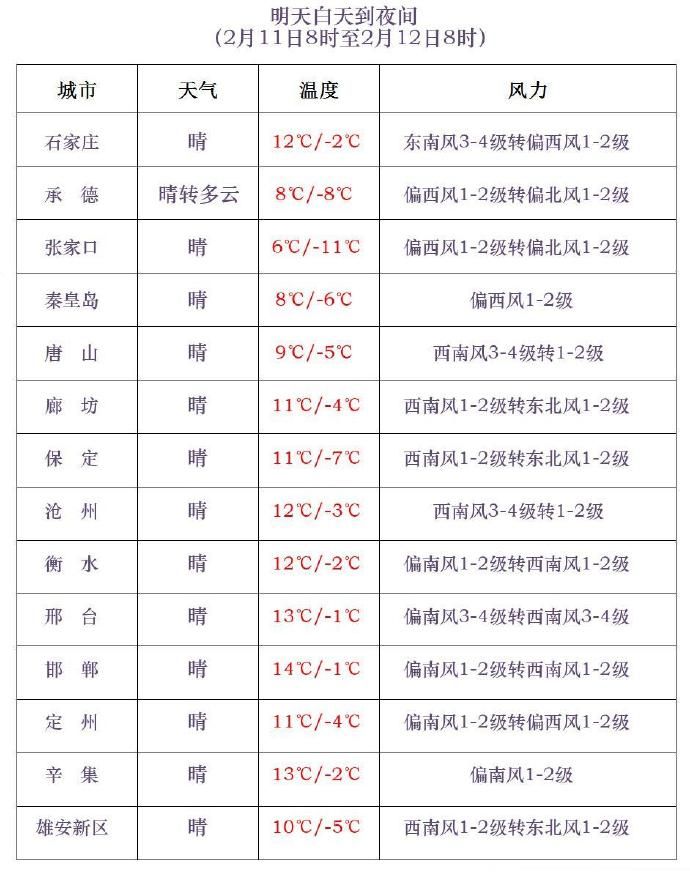 河北省氣象臺2026年2月10日11時發布天氣預報: