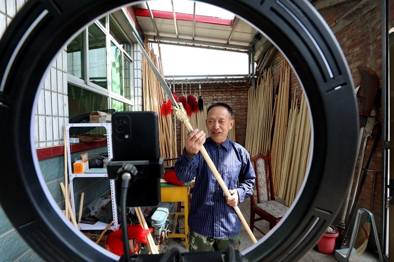 ↑在安次區(qū)調(diào)河頭鎮(zhèn)蠟桿生產(chǎn)基地,村民正在通過(guò)網(wǎng)絡(luò)直播銷售由蠟桿制成的紅纓槍。(高語(yǔ)婧 攝)