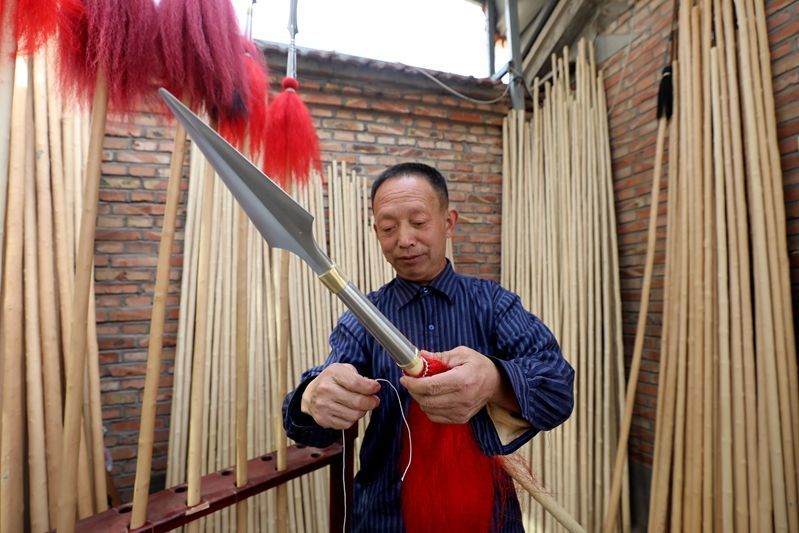 ↑在安次區(qū)調(diào)河頭鎮(zhèn)蠟桿生產(chǎn)基地,村民正在組裝蠟桿與槍頭。(高語(yǔ)婧 攝)