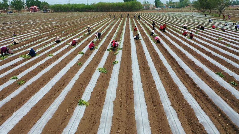 ↑4月25日,在廊坊市安次區葛漁城鎮紅薯基地,農民正在栽種紅薯秧苗(無人機照片)。 張明亮 攝