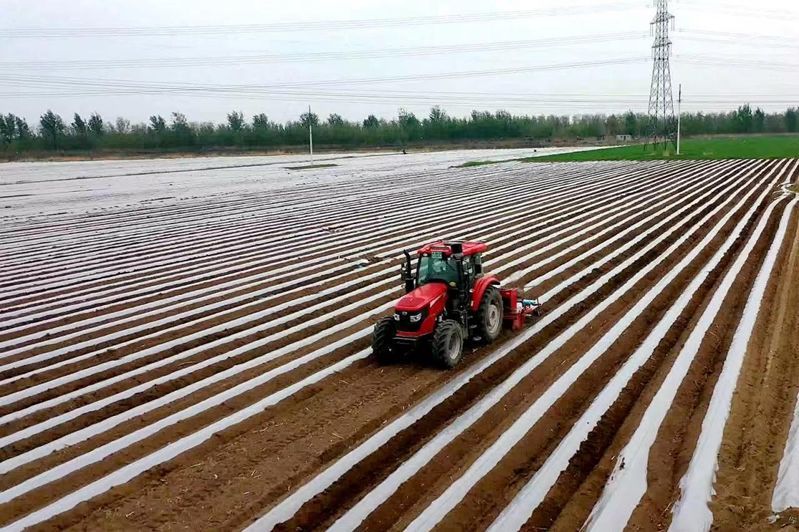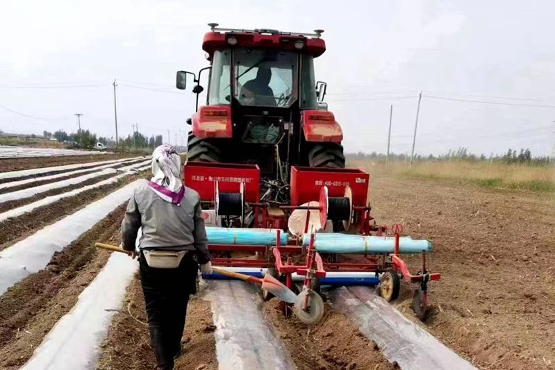 ↑4月25日,在廊坊市安次區葛漁城鎮紅薯基地,起壟覆膜滴灌一體機正在田間作業。(高語婧 攝)