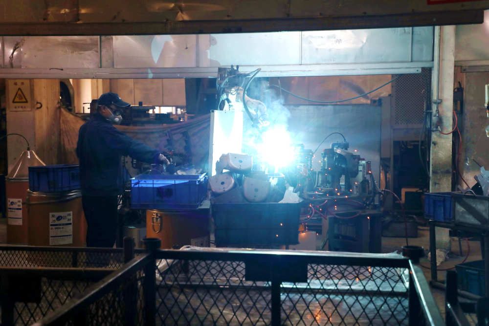 ↑4月24日,在香河縣一家機械制造企業生產車間內,工人正在對金屬工件進行焊接。(朱鈺爽 攝)