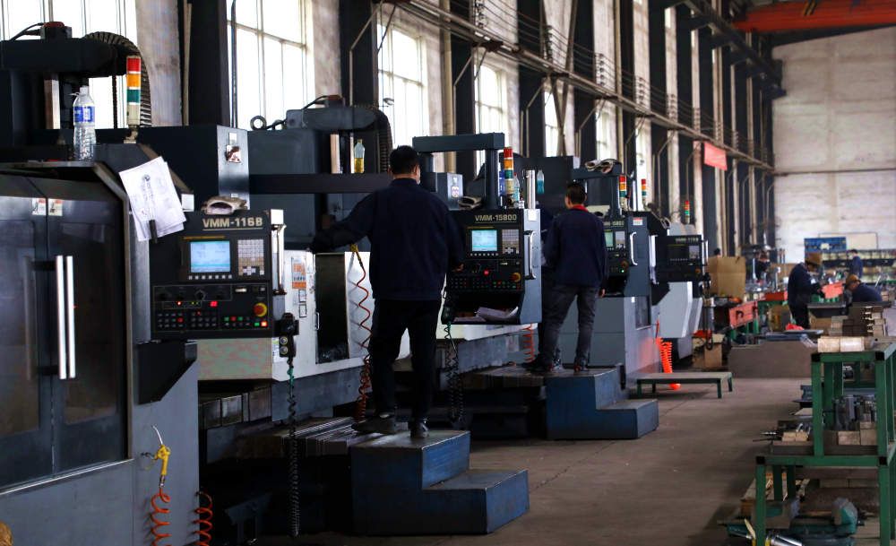 ↑4月24日,在香河縣一家制件企業生產車間內,工人正在操作數控機床對模具進行加工。(朱鈺爽 攝)