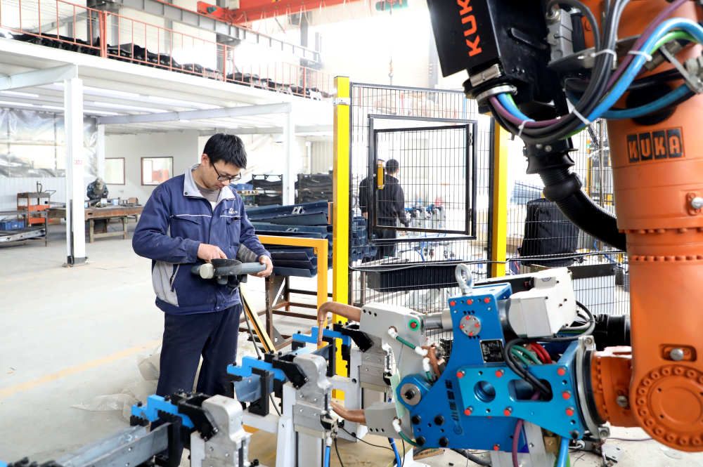 ↑4月24日,在香河縣一家制件企業生產車間內,工人正在操作機器人進行加工作業。(朱鈺爽 攝)