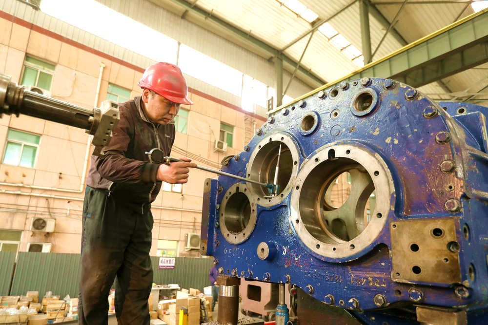 ↑4月24日,在香河縣一家機械制造企業生產車間內,工人正在對工件精度進行測量。(朱鈺爽 攝)