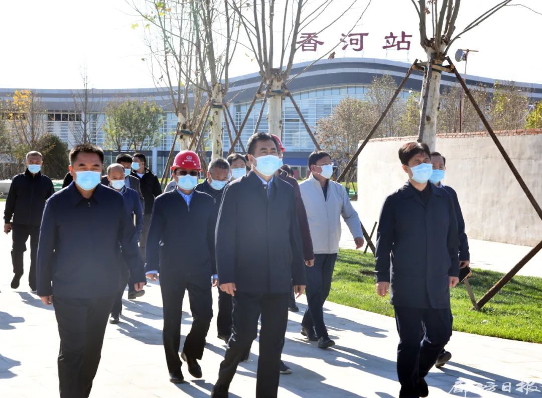 在香河高鐵站前廣場綜合體項目現場,李國勇實地了解規劃建設、項目進展等情況。他強調,要堅持科學規劃引領,深入做好片區開發綜合研究,進一步優化功能布局、完善基礎設施,提升綜合承載能力。要堅決抓好安全生產和疫情防控,加強施工人員車輛管理,及時消除風險隱患,在保證質量和安全的前提下加快建設進度。