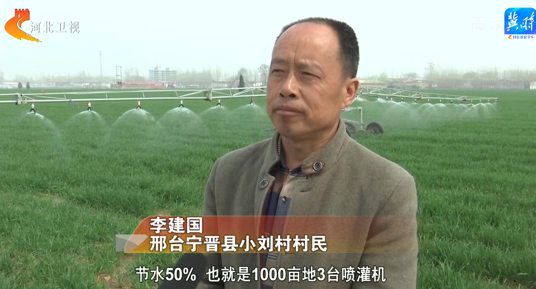 在石家莊市趙縣的麥田里,一排排伸縮式噴灌器正進行噴灑作業。固定伸縮式噴灌可以針對不同類型的麥田更換不同大小的噴頭,可以通過掩埋于淺土中的管道將灌溉用水和肥料精準地輸送到小麥根系。