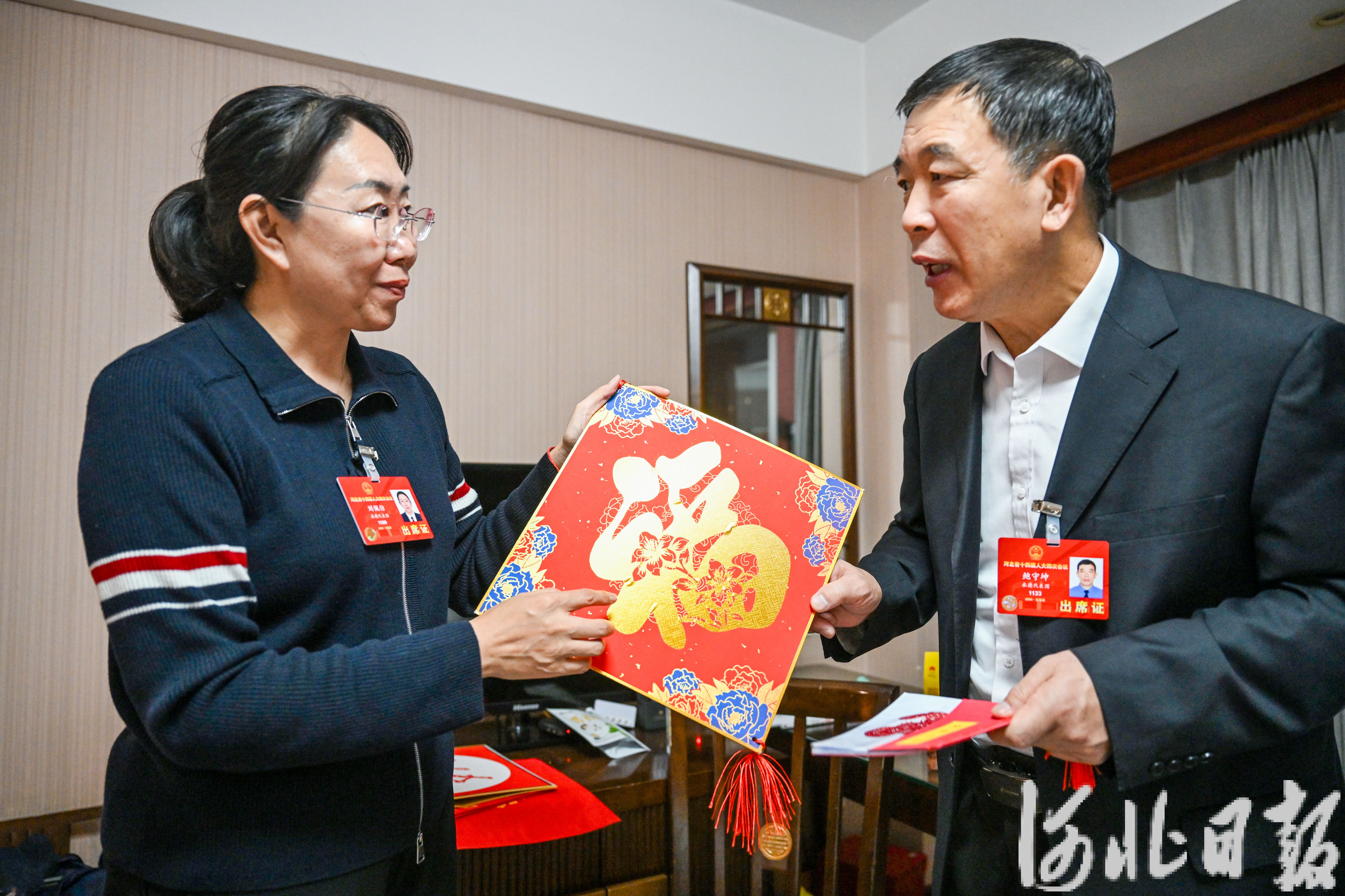 1月26日,劉佩仿代表(左)向鮑守坤代表介紹豐寧非遺文創產品。河北日報記者李東宇攝