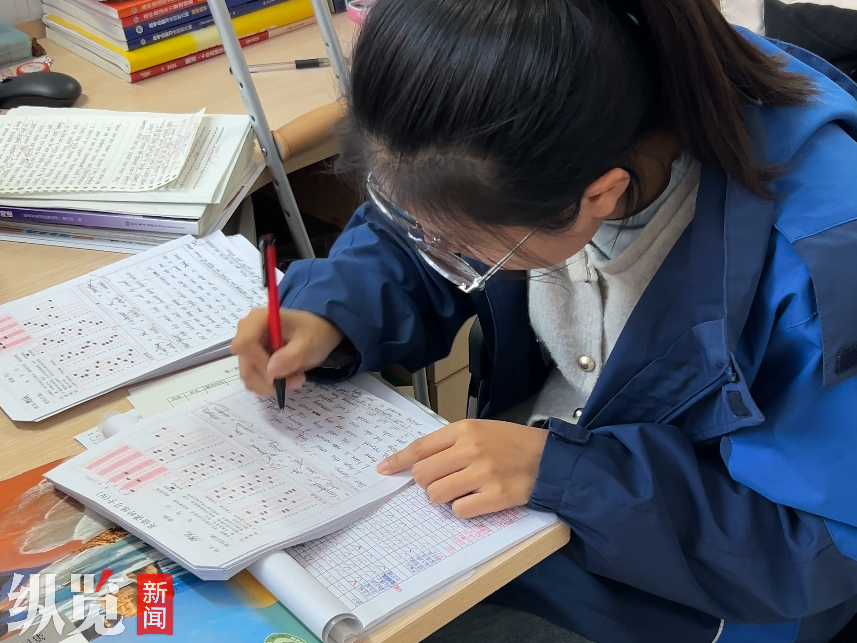 劉若寒老師批改卷子。保定市宏利佳高級(jí)中學(xué)供圖