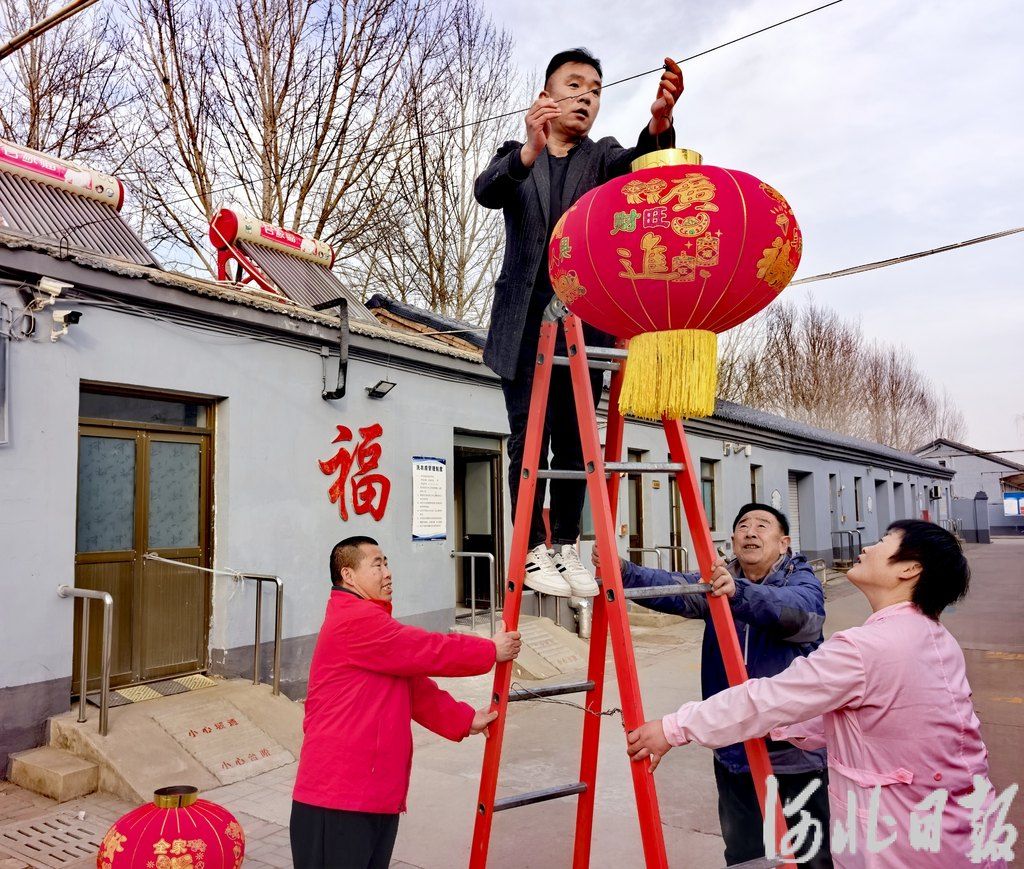 2月10日,農(nóng)歷臘月二十三,衡水市冀州區(qū)集中供養(yǎng)中心院長(zhǎng)孫紅旺(左二)在院里掛起了紅燈籠。河北日?qǐng)?bào)記者邢云攝