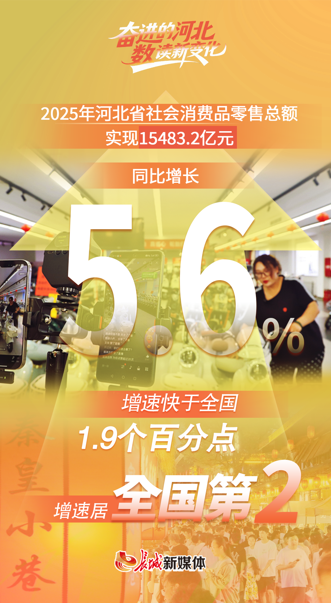 5.6%是2025年河北省社會(huì)消費(fèi)品零售總額(以下簡(jiǎn)稱(chēng)“社零總額”)的同比增速,這個(gè)數(shù)字快于全國(guó)1.9個(gè)百分點(diǎn),在全國(guó)排第2位,反映了河北擴(kuò)內(nèi)需、促消費(fèi)政策落地顯效。