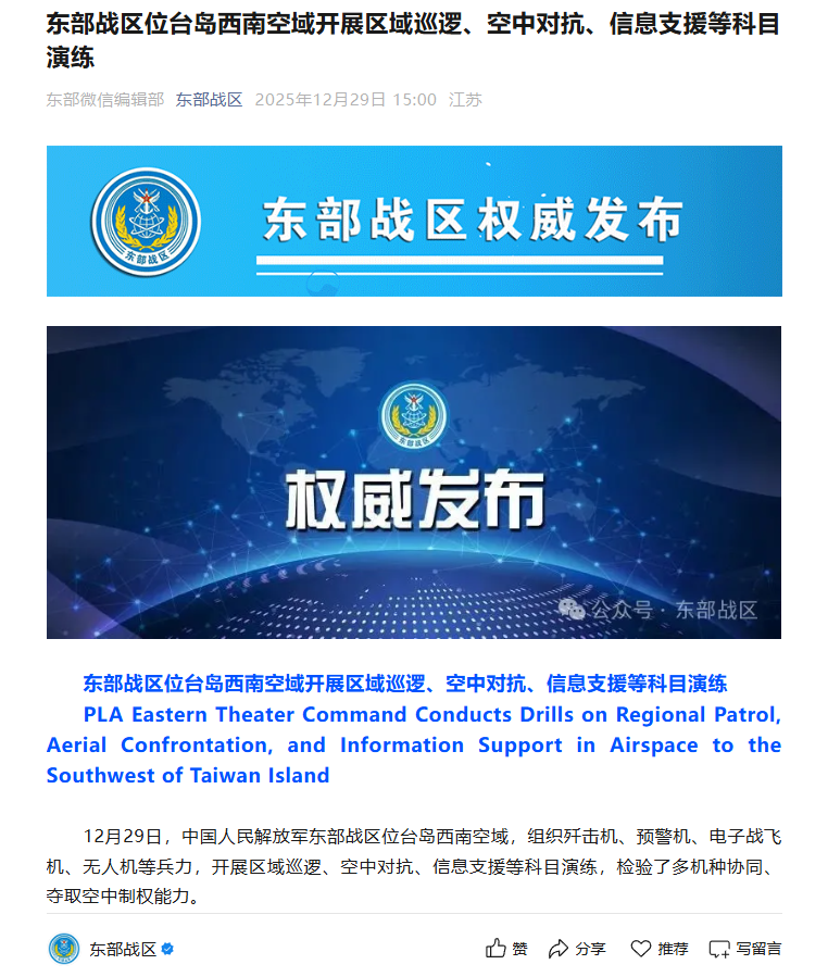 12月29日,中國人民解放軍東部戰區位臺島西南空域,組織殲擊機、預警機、電子戰飛機、無人機等兵力,開展區域巡邏、空中對抗、信息支援等科目演練,檢驗了多機種協同、奪取空中制權能力。