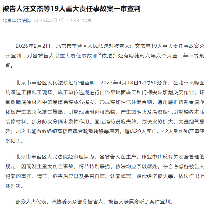 2026年2月2日,北京市豐臺(tái)區(qū)人民法院對(duì)被告人汪文杰等19人重大責(zé)任事故案公開宣判,對(duì)各被告人以重大責(zé)任事故罪依法判處有期徒刑六年六個(gè)月至二年不等刑期。