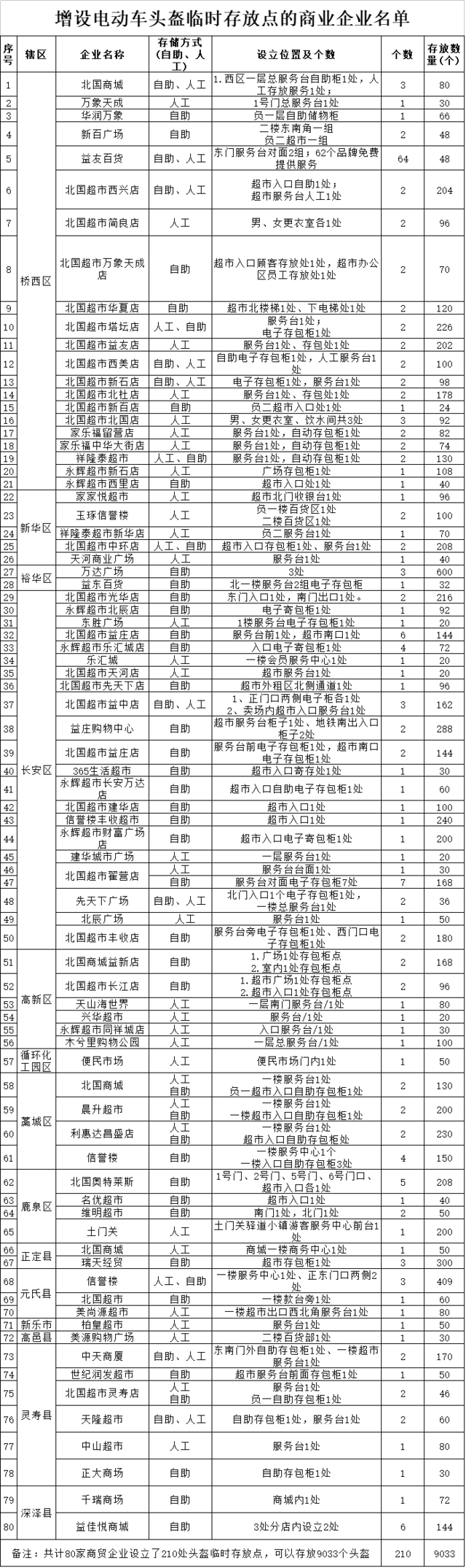目前,全市已有北國商城、新百廣場、東勝廣場、裕華萬達、天山海世界等80家商貿服務企業設立了210處電動車頭盔臨時存放點,可為市民存放9033個頭盔。