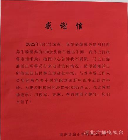 冀時客戶端報道(河北臺 任亞棟 許丙路)前段時間,滄州南皮一家養(yǎng)殖場的100多頭牛在深夜跑走。南皮縣公安局潞灌派出所4位民警和輔警及時趕到,和工人一起將走散的牛全部趕回養(yǎng)殖場,幫養(yǎng)殖場場主挽回100多萬元損失。