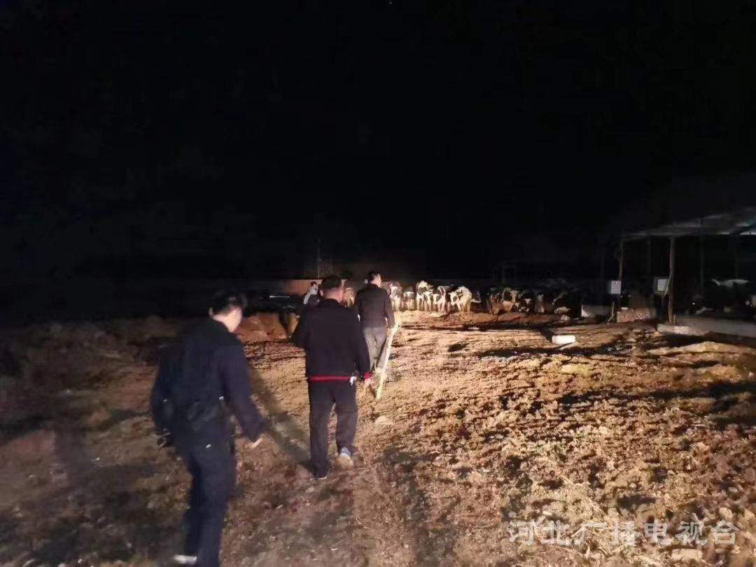 南皮縣公安局潞灌派出所的民警楊連學(xué)和同事刁俊軍、齊琳、李興建立刻趕到現(xiàn)場,發(fā)現(xiàn)跑出去的牛分成了五六個小群分散在地里。夜里視線不好,養(yǎng)殖場附近還有一個深約五六米的大坑。這些牛都是成年牛,一旦受刺激,可能會頂傷人。