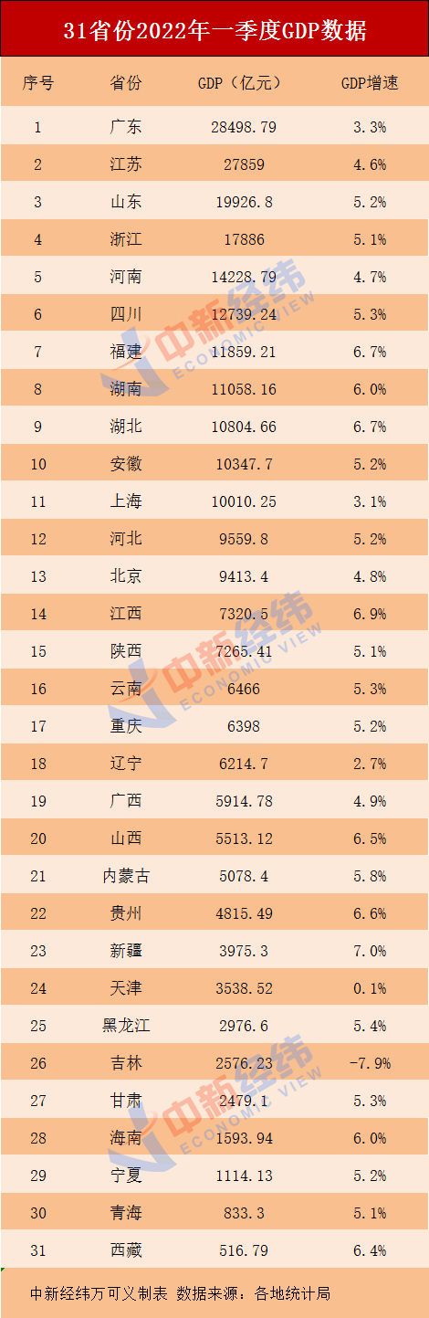 隨著西藏于5月1日發(fā)布2022年一季度經濟運行情況,31省份一季度GDP數據已全部出爐。總量方面,粵蘇魯穩(wěn)居前三;增速方面,23省份高于“全國線”,新疆表現(xiàn)最佳,增速達到7.0%。