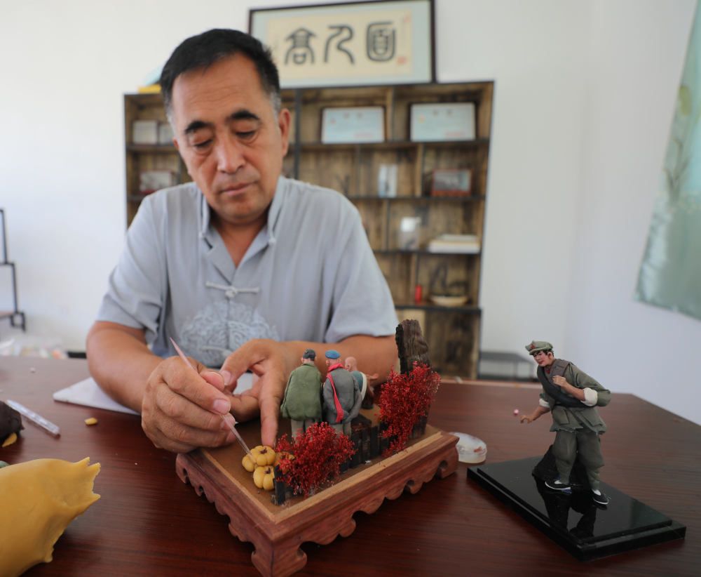 ↑6月15日,在固安縣菜園村面塑技藝傳承工作室,高繼澤正在制作面塑藝術品。(肖敬凱 攝)