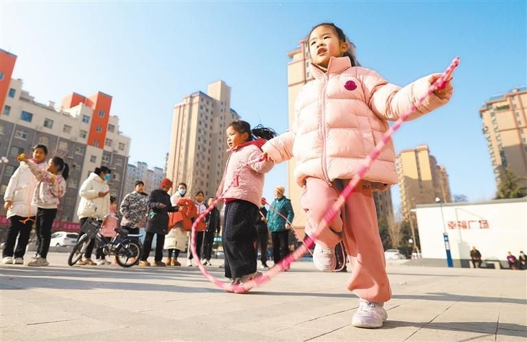 2月1日,小朋友們?cè)谒f村幸福廣場(chǎng)跳繩。石家莊日?qǐng)?bào)記者梁子棟 攝