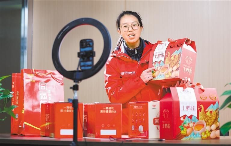 2月1日,塔元莊村文產(chǎn)電商直播實(shí)訓(xùn)基地,工作人員在直播推介當(dāng)?shù)剞r(nóng)產(chǎn)品。塔元莊村與本地企業(yè)合作創(chuàng)建品牌,精選產(chǎn)品、統(tǒng)一包裝,提升農(nóng)副產(chǎn)品附加值。石家莊日?qǐng)?bào)記者梁子棟 攝