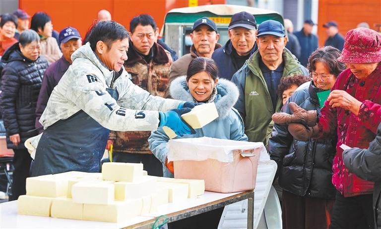 2月5日,塔元莊村村民在領(lǐng)取免費(fèi)的年貨豆腐。春節(jié)臨近,塔元莊村舉辦年貨大集、送春聯(lián)等活動(dòng),為村民送上新春祝福。石家莊日?qǐng)?bào)記者梁子棟 攝