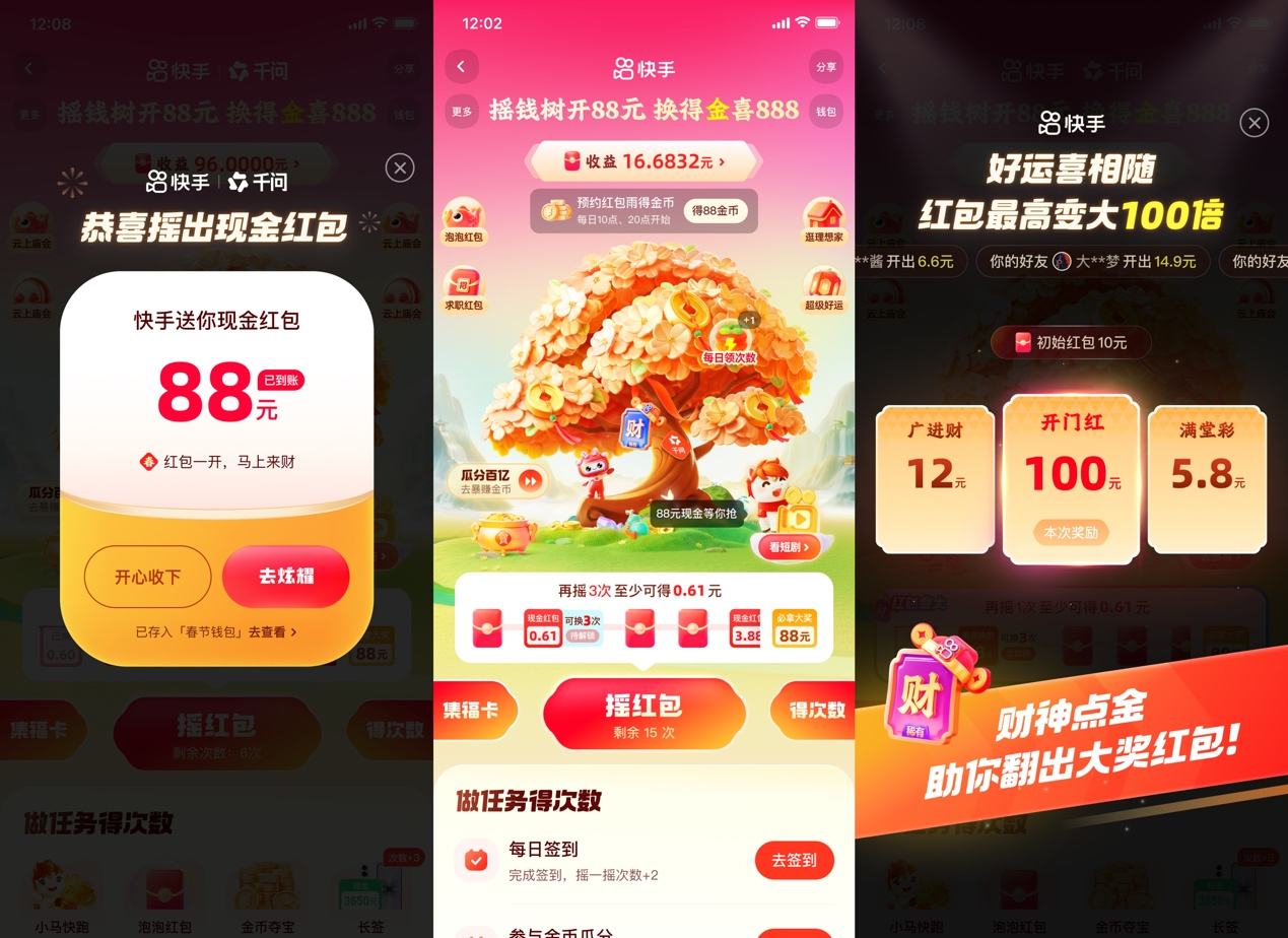 此外,在今年的CNY活動中,快手推出了全新的“換紅包”和“點金卡”的玩法。用戶可通過 “一鍵換紅包” 將小額紅包有機會兌換為大額紅包,兌換過程中隨機掉落的 “財神點金卡”,能讓紅包最高放大 100 倍,封頂 888 元,卡片還可贈送給好友共享福利。