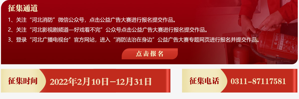 因疫情防控原因,為切實(shí)保障參與“第二屆河北省消防電視公益廣告大賽”作品與作者權(quán)益,并進(jìn)一步發(fā)動(dòng)全社會(huì)參與熱情,宣傳消防法治精神,擴(kuò)大大賽影響力。經(jīng)組委會(huì)研究決定,推遲本屆大賽原定于2022年6月10日截止的作品征集時(shí)間至2022年12月31日,特此公告。延期后作品初評(píng)時(shí)間為2023年1月1日至1月20日;專(zhuān)家評(píng)審時(shí)間為2023年1月28日至2月20日;獲獎(jiǎng)作品公示時(shí)間為2023年2月21日至2月25日;獲獎(jiǎng)作品展播時(shí)間為2023年2月26日至3月31日,前期已報(bào)送作品保留參賽資格。感謝社會(huì)各界的理解、支持與參與,并期待更多創(chuàng)作者,拿出更多作品參與本屆大賽。