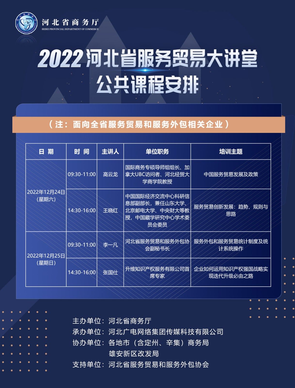 本活動定于2022年12月24日至12月27日在線舉行,組織邀請國內服務貿易行業專家通過線上直播形式對全省服務貿易外包企業從業人員進行專業課程培訓。旨在提高服務貿易企業人員在服務貿易工作中所需的各方面素質和技能,助力推動我省服務貿易高質量發展。