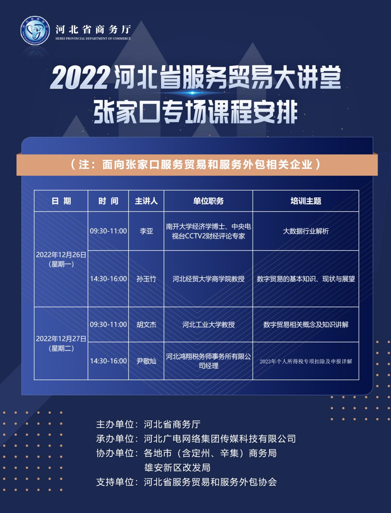 為貫徹落實省委、省政府《關于推進服務貿易高質量發展的培訓意見》的文件精神,規范省內相關企業服務貿易和服務外包業務數據報送標準,進一步做大做強我省服務貿易規模,提升服務貿易質量和效益,發揮服務貿易在推進河北經濟結構調整和貿易轉型升級中的積極作用,省商務廳決定今年繼續開展“服務貿易大講堂活動”。