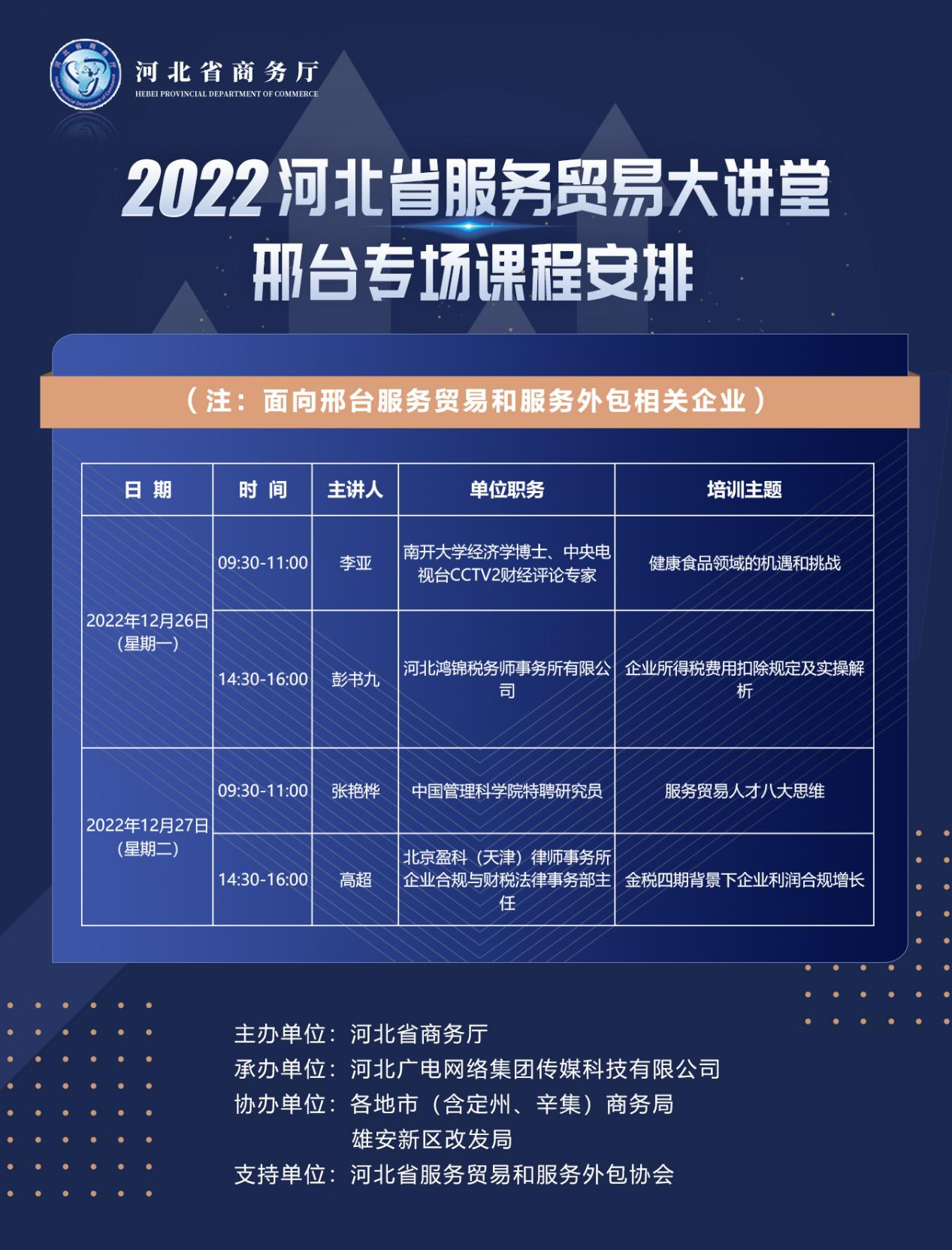 為貫徹落實省委、省政府《關(guān)于推進服務(wù)貿(mào)易高質(zhì)量發(fā)展的培訓(xùn)意見》的文件精神,規(guī)范省內(nèi)相關(guān)企業(yè)服務(wù)貿(mào)易和服務(wù)外包業(yè)務(wù)數(shù)據(jù)報送標(biāo)準(zhǔn),進一步做大做強我省服務(wù)貿(mào)易規(guī)模,提升服務(wù)貿(mào)易質(zhì)量和效益,發(fā)揮服務(wù)貿(mào)易在推進河北經(jīng)濟結(jié)構(gòu)調(diào)整和貿(mào)易轉(zhuǎn)型升級中的積極作用,省商務(wù)廳決定今年繼續(xù)開展“服務(wù)貿(mào)易大講堂活動”。