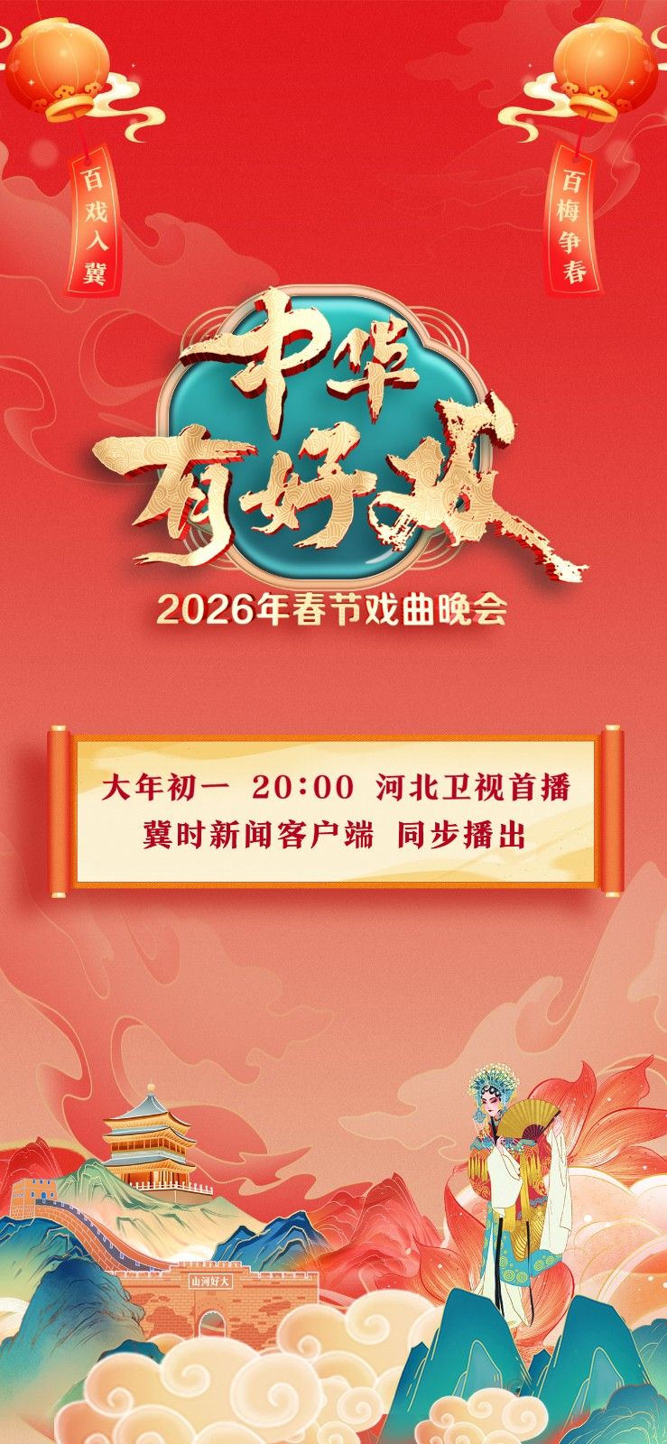 冀時新聞河北廣播電視臺《中華有好戲》2026年春節戲曲晚會以“百戲入冀 百梅爭春”為主題,緊扣馬年、合家歡等新春內核,邀請到全國38個劇種,109朵梅花同臺演繹,呈現一場滿漢全席般的梨園盛景,展現中華優秀傳統藝術在新時代的雋永魅力。2月17日(正月初一)20:00河北衛視傾情奉獻。